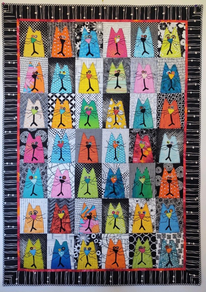 Carol V – “Too Much Catnip” was a collaborative project with my neighbor, Marilyn H. We donated it to Shelby’s Place/Harbor Humane for use in future fundraisers. The clipped ears on some of the cats denotes a spayed or neutered feral cat.