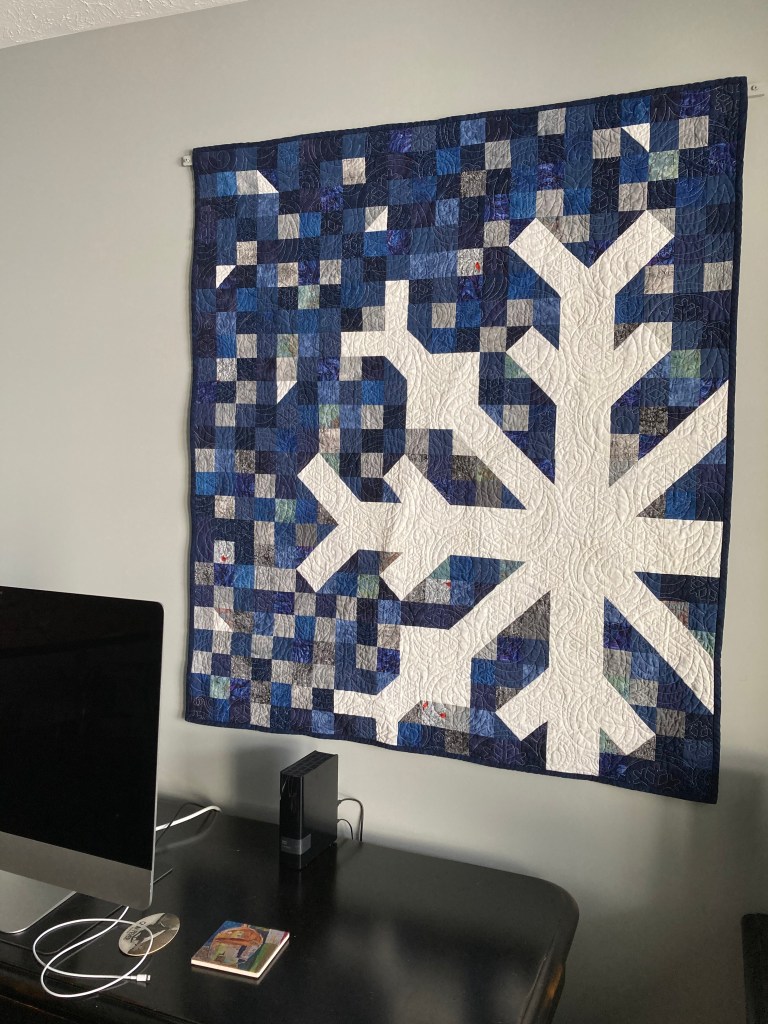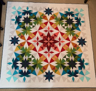Barb M’s snowflake. Drafted smaller than original pattern and using up more stash fabics.