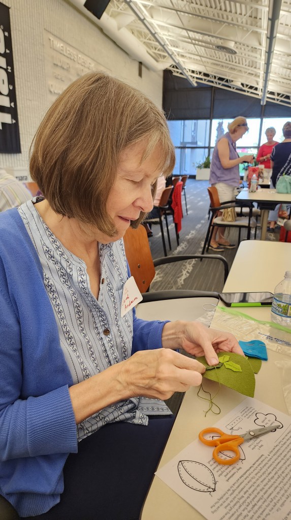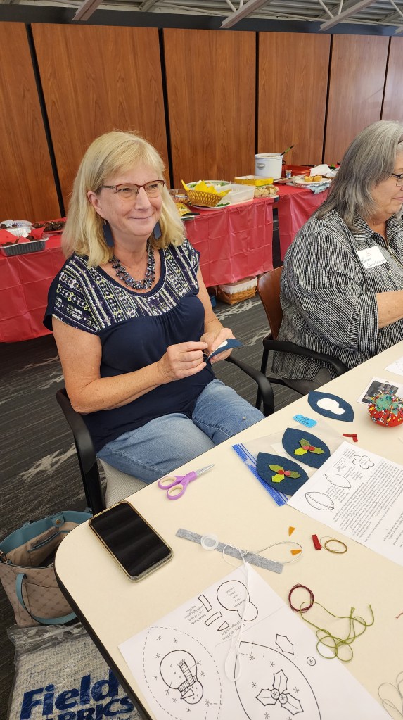 Here’s a few pictures from the July meeting. You can see the delicious, overloaded finger food tables in the back on one of them. It was a fun night making ornaments, enjoying a meal and chatting!